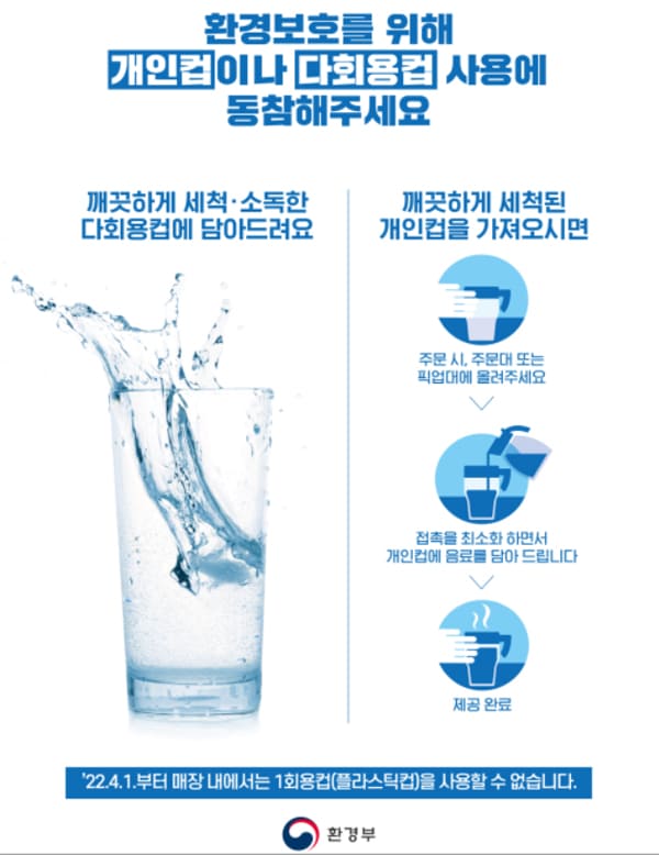 환경부에서는 매장 방문시 개인컵(텀블러 지참), 다회용컵 사용 캠페인을 하고 있습니다. 친환경을 위해 최소한의 방침은 지켜주시는 것이 좋겠습니다.