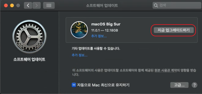 소프트웨어 업데이트 메뉴로 들어가면 macOS Big Sur 업데이트가 준비되었다고 뜹니다. 무려 12.18 GB 이기 때문에 어느 정도 시간이 걸릴 건 예상하시고 진행하셔야 합니다. 혹시 모르니 백업할 파일은 미리 해두는 것도 좋겠죠.