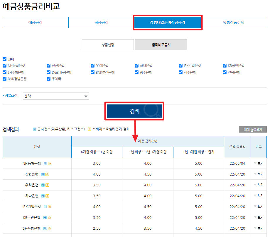 다수의 은행에서 가입 가능하며 최대 월 40만원 한도까지 적립할 수 있습니다. 전체 은행의 금리를 비교하려면 전국 은행연합회 소비자포털 홈페이지에서 다음과 같이 금리를 비교 할 수 있습니다.