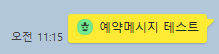 지정한 시간에 메시지가 전송 되었습니다. 제가 보낸 예약메시지는 '예약메시지 테스트'인데 앞에 죠르디 캐릭터가 나오네요. 예약 메시지로 보냈다는 표시 인 것 같습니다. 단, 상대방 쪽에는 저 죠르디 캐릭터는 표시는 안 되더라구요. 일반 메시지처럼 보입니다. +내용 수정 : 삼성폰은 아직 기능이 안들어가서 죠르디가 안보이는 것이였네요. PC버전과 아이폰에서는 죠르디가 보입니다. 그렇게 되면 '예약 메시지'라는게 너무 티나는거 아닌가요? 예약 메시지가 상대방한테는 '티가 안나야' 진정한 기능인 것 같은데 아쉽네요. 차후 개선되길 바랍니다.