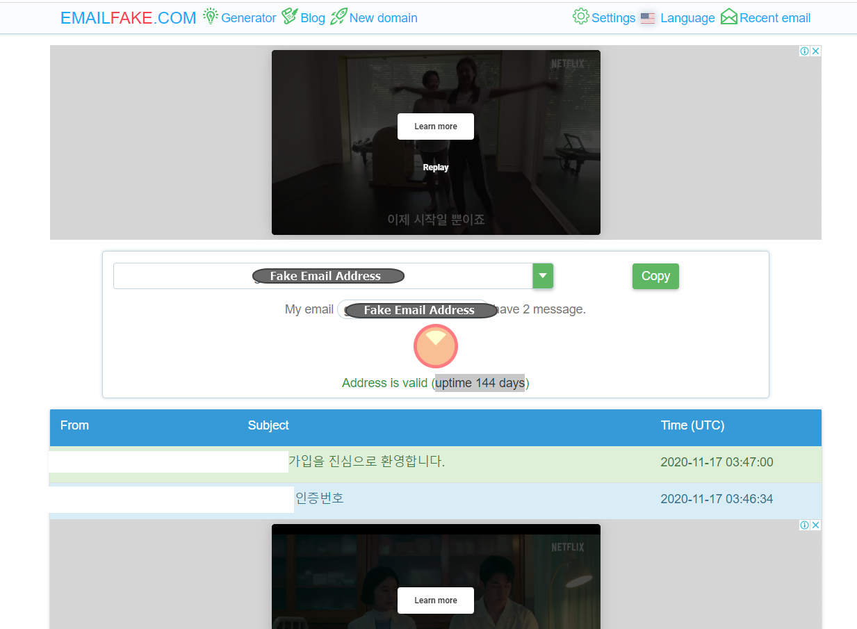 위 사이트로 들어가시면 random으로 만들어진 이메일 주소가 보이실 거예요. 어떤 사이트에 회원가입을 할 때 이메일 계정이 필요한 경우 이 이메일 주소를 입력하시고, 인증코드도 받을 수 있습니다.