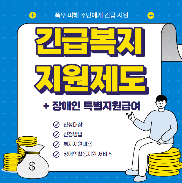 수도권에 심각한 폭우로 인해 집중호우 피해를 본 취약계층에 대해 긴급복지급여를 신속하게 지급 합니다. 또한, 자연재해로 피해를 입은 장애인 활동지원수급자 분들에게도 특별지원 급여를 지원 합니다. 신청대상과 지원내용, 신청 문의처까지 알아보겠습니다.