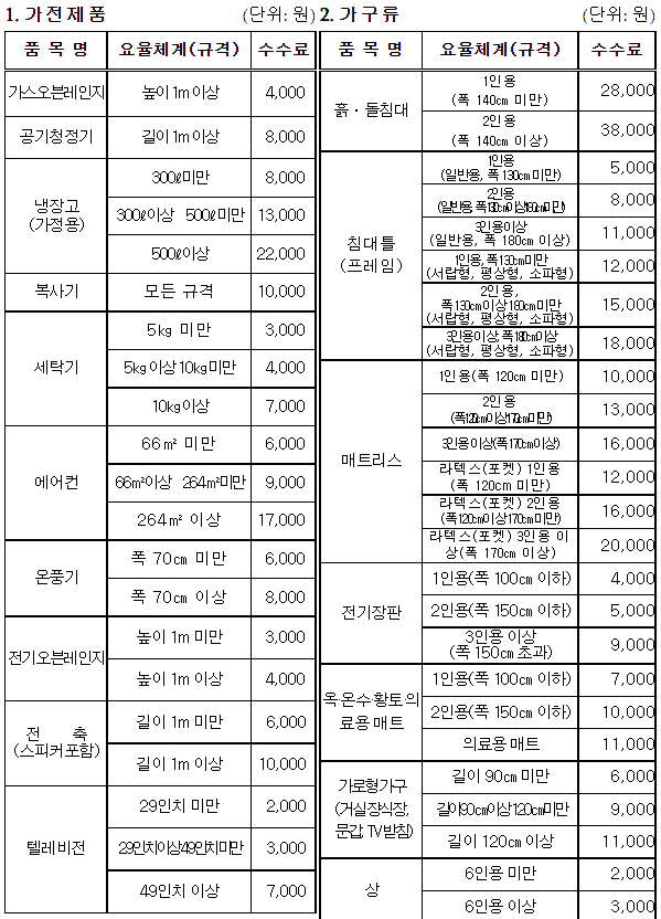 대형폐기물 품목별로 버리는데 수수료가 발생 합니다. 제가 사는 지역의 대형폐기물 수거 수수료는 대략 다음과 같습니다. 지역마다 다를 수 있으니 참고만 하시기 바랍니다.