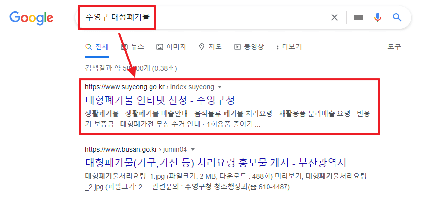 인터넷을 통해 대형폐기물 수거 신청을 할 수 있습니다. 이것 또한 지역마다 대형폐기물 수거 홈페이지가 다릅니다. 제가 사는 지역을 예를 들면, '부산광역시 수영구'입니다. 네이버나 구글과 같은 검색창에 '수영구 대형폐기물'이라고 검색하면 신청할 수 있는 홈페이지가 나옵니다.