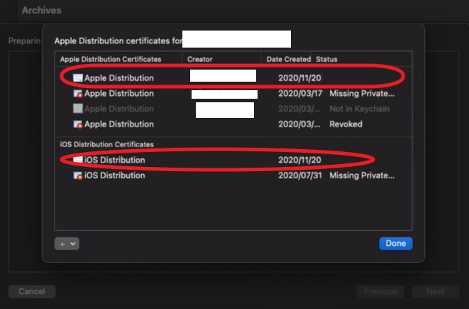 위 화면과 같이 유효한 Apple Distribution이 떠있는 걸 확인할 수 있다. "Done" 버튼을 누른다.