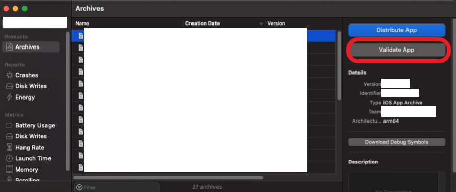 App의 유효성을 검사하기 위해 Validate App 버튼을 누른다. (보통 앱 스토어로 업로드시 인증서가 꼬일 경우 저걸로 체크해보면 에러가 표시됨)