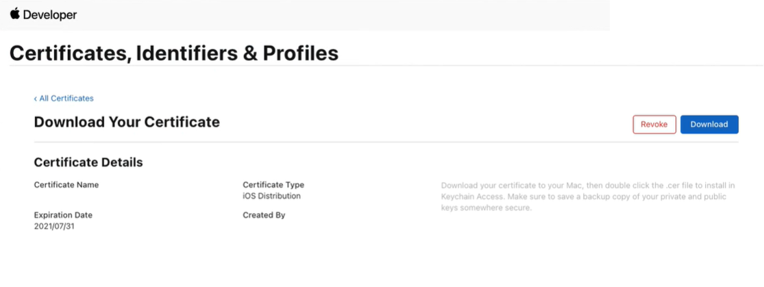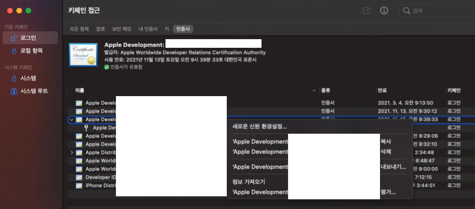 Apple Developer 웹사이트에 접속해서 Account > Certifications, Identifiers & Profiles 내의 내 인증서를 확인해본다. 그리고 혹시나해서 Download해서 더블클릭해서 실행시켜보았다.