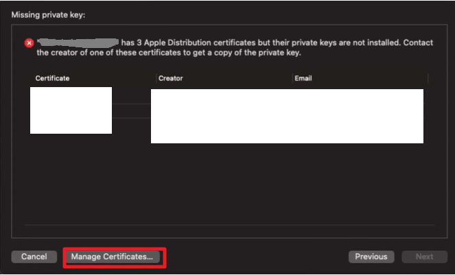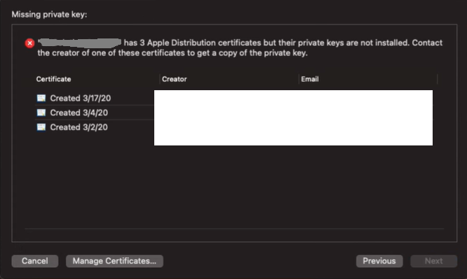 Validation후 뭐가 문제인지 위와 같은 에러가 나온다. Missing private key가 원인. you app has 3 Apple Distribution certifications but their private keys are not installed. Contact the creator of one of there certificates to get a copy of the private key. 왜 인지는 모르겠는데 인증서가 3개나 있음 ( 뭐 설정하다가 추가가 된듯하다... ) 근데 private key가 없다. 보통 certificate안에는 public key와 private key가 쌍으로 같이 들어있는 걸로 알고 있는데 왜 private key가 누실되었을까..?