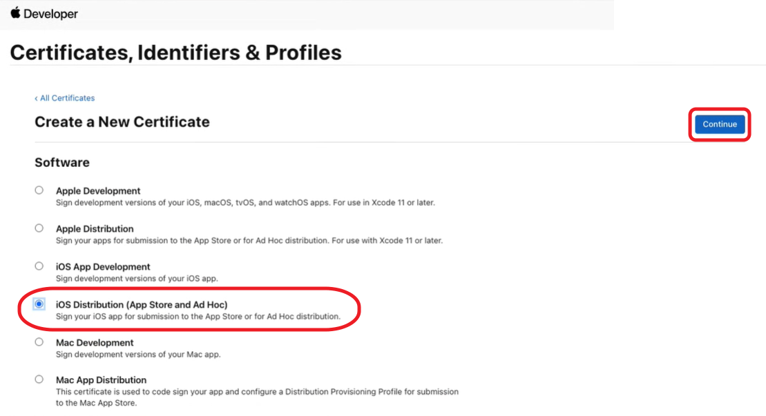 앱 배포용이므로 iOS Distribution (App Store and Ad Hoc)를 선택하고 'Continue'를 누른다.