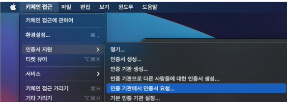자, 일단 새로운 Certificate를 발급받기 위한 CSR(CertificateSigningRequest)파일이 필요하니 그거부터 만들어보자. 키체인 접근에 들어가면 키체인 접근 > 인증서 지원 > 인증 기관에서 인증서 요청을 누른다.