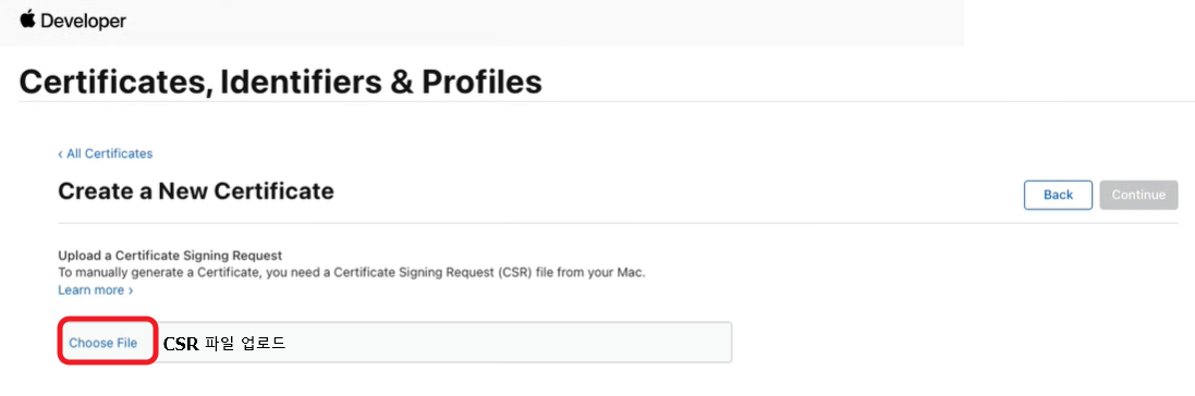 아까 다운로드 해놓았던 CSR 파일을 업로드 하고 'Continue'를 하면 확장자가 .cer로 된 인증서 파일이 보이며 Download 하고 실행시켜준다.