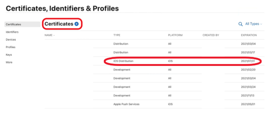 기존에 사용하던 iOS Distribution을 Revoke 시키고 위에 'Certificates +' 버튼을 눌러 인증서를 생성한다.