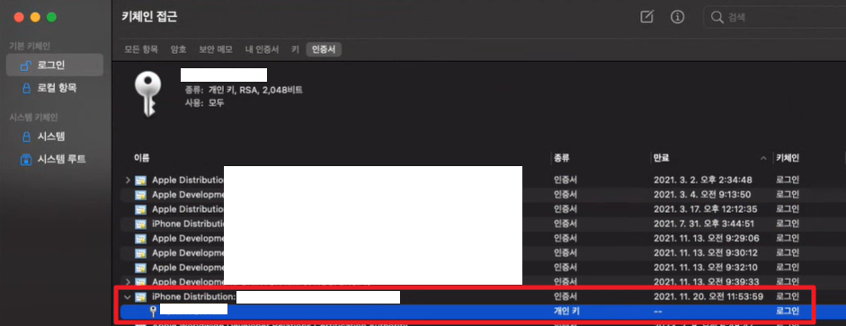 이런저런 인증서가 있는데 여튼 인증서에 개인키가 있는 경우 열쇠모양으로 하위에 추가가 되어있는데, 이 인증서에는 그게 안보였다. 개인키를 어떻게 따로 가져올까? .p8이랑 .p12파일도 예전에 백업 되어있던 게 있던데 이걸로 될려나 이것저것 해봤는데 잘 안되었다.