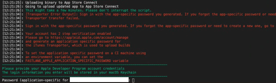 다시 fastlane으로 app 배포를 시도해보았다. 새로운 인증서라 그런지 Fastlane에서 app specific password를 요구한다. 보관해놓았던 app specific password 를 복사, 붙여넣기 한다.