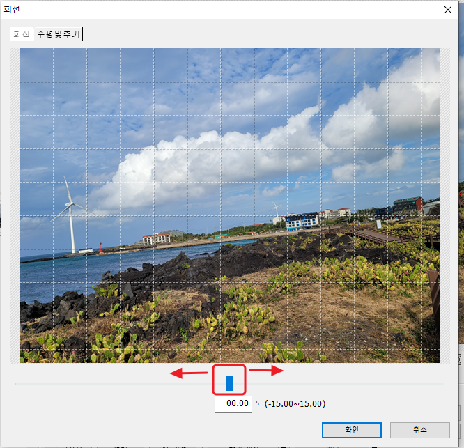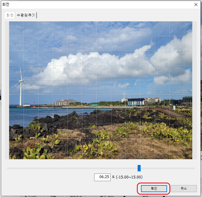 화면에 보이는 격자무늬를 참고해서 지평선과 격자무늬가 수평을 이루는지 확인해서 수평을 맞추면 됩니다. 저는 오른쪽으로 당겨서 기울임을 많이 보완했습니다. 몇 도를 더 회전시켰는지 밑에 수치가 자동으로 나오네요. '확인' 버튼을 누릅니다.
