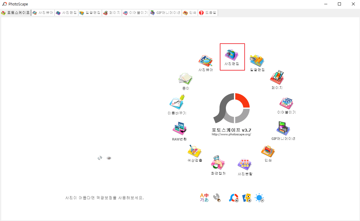 포토스케이프를 열면 여러가지 기능이 나오고 이 중에 사진편집을 클릭합니다.