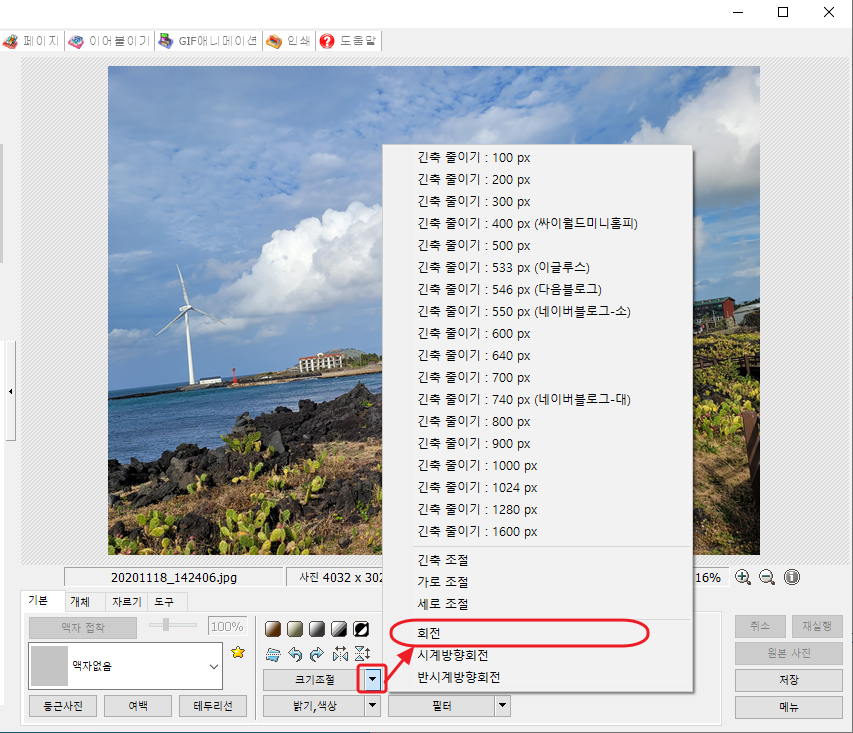 밑에 여러가지 메뉴들 중에 크기조절 옆에 네모박스를 누르면 여러가지 크기조절 메뉴가 나오고 저기서 '회전'을 선택 합니다.
