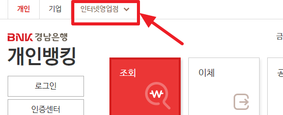 경남은행 홈페이지 위에 보시면 [ 인터넷영업점 ] 이라고 되어 있는 곳을 클릭하면 BNK 경남은행 인터넷 영업점 화면이 나옵니다. 이 곳에서는 로그인 없이 간단하게 업무를 진행할 수 있어 편리 합니다.