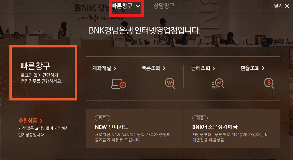빠른창구에서는 BNK경남은행 계좌개설과 금리, 환율 조회를 할 수 있습니다.