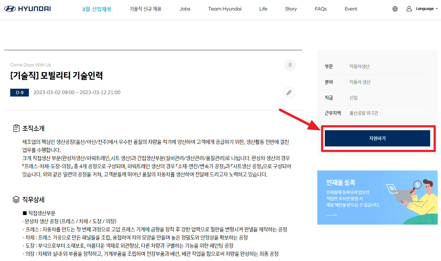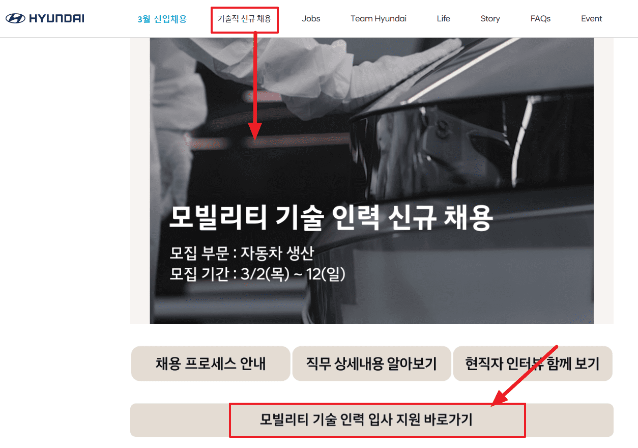 ▲ 화면 아래로 내려가보면 [ 모빌리티 기술 인력 입사 지원 바로가기 ] 버튼이 보이면 클릭 합니다.