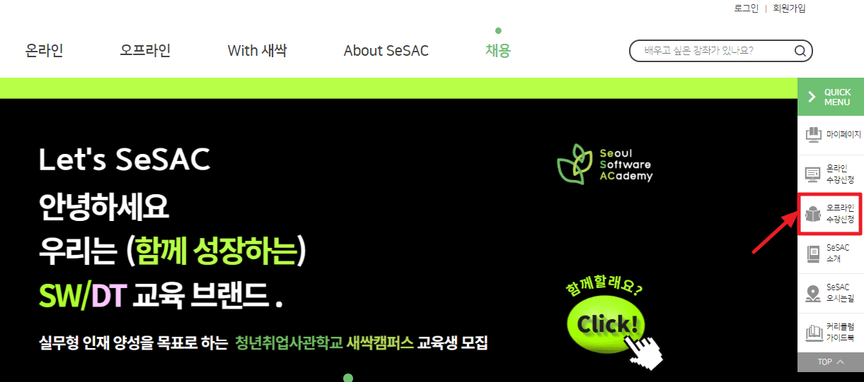 2. 홈페이지 상단 오프라인 수강신청하기 버튼을 클릭 합니다.