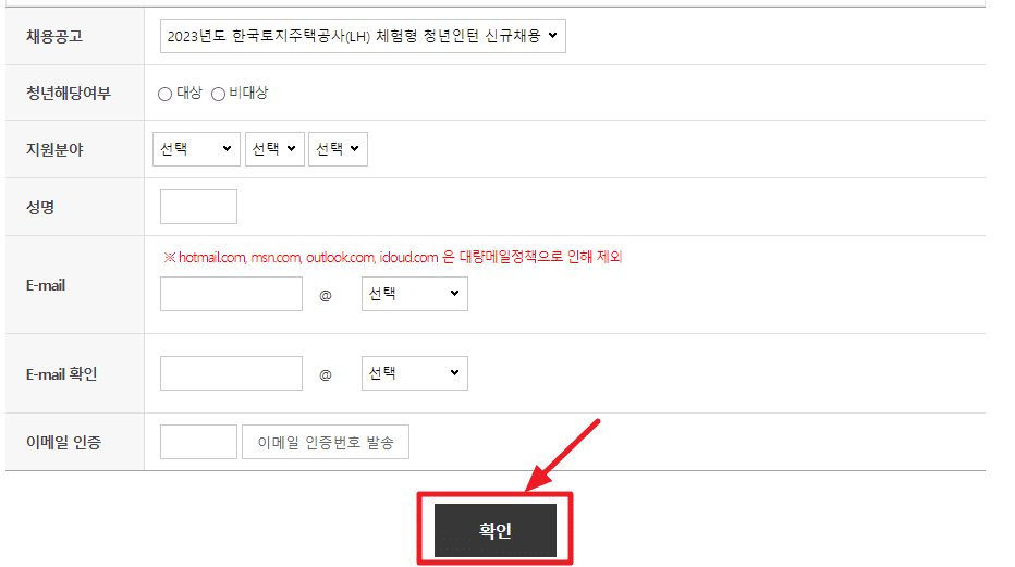 그리고 화면의 아래쪽에서 본인의 개인정보를 기입 후 [ 확인 ] 버튼을 눌러 입사지원을 진행하면 됩니다.