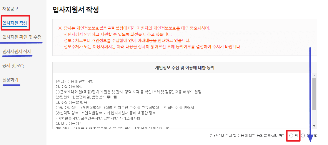 LH공사 채용 홈페이지 왼쪽메뉴에서 [ 입사지원 작성 ] 메뉴를 클릭하고 개인정보 수집에 대한 동의를 체크 합니다.