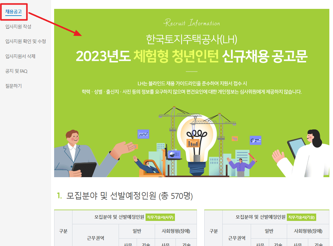 LH 채용 관련 홈페이지는 채용공고, 합격자 발표, 공지사항의 구성으로 간결하게 배치 되어있습니다. 채용공고를 확인하고 본인이 자격요건이 적합한 지 확인 해보세요.