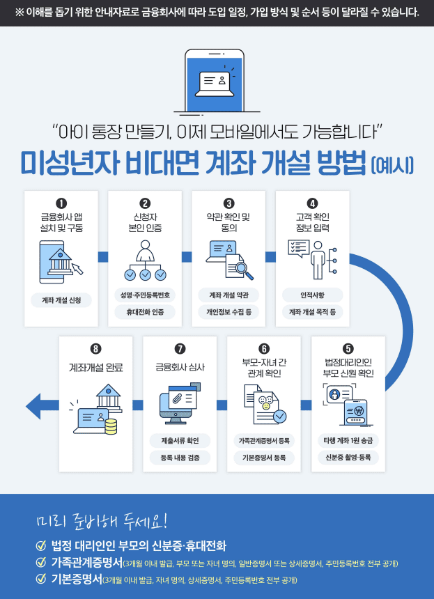은행사별로 구체적인 계획이 나오는대로 공지가 올라올 것 같습니다. 도입 일정 참고하셔서 자녀의 은행 계좌 개설에 도움되길 바랍니다.