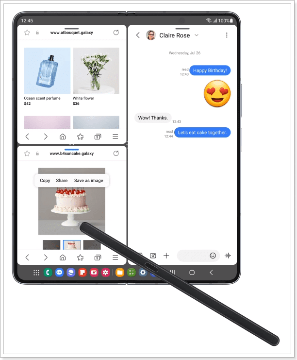 z폴드5 화면에 최대 3개의 앱을 띄워 분할해서 사용가능해 멀티태스킹이 용이 합니다. 예를 들면, 유투브를 보면서 쇼핑, 검색, 게임 등의 작업을 동시에 할 수 있죠.