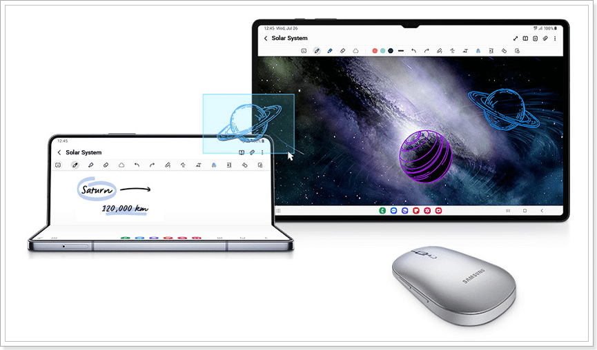갤럭시 유저라면 다양한 갤럭시 기기들을 가지고 있으실 겁니다. 갤럭시 Z폴드5, 갤럭시 탭 S9 등의 갤럭시 기기를 동시에 제어할 수 있습니다. 키보드와 마우스를 이용해 기기 간의 복사, 붙여넣기, 드래그 해서 이동하기 등의 갤럭시 기기의 멀티컨트롤이 가능 합니다.
