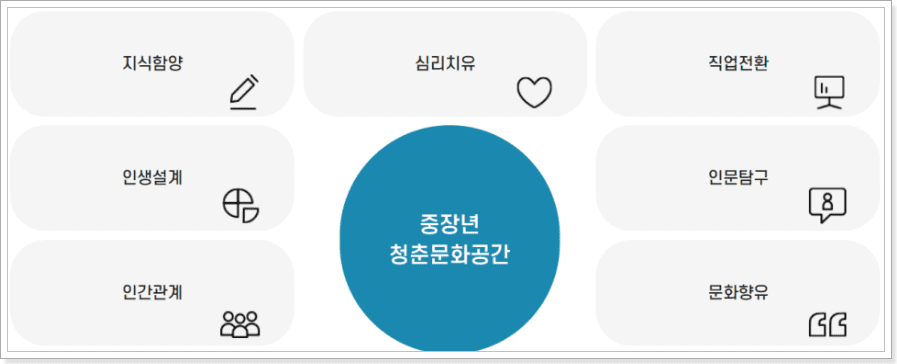 중장년 생애주기 특성을 고려해 제공 합니다. 제2의 인생을 설계할 수 있는 중장년 일자리 문화 공간 입니다.