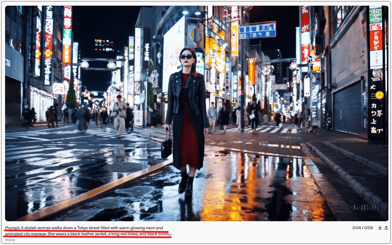 사진 왼쪽 아래의 Prompt라고 써있는데 '명령어'라는 뜻 입니다. ' 검은 가죽자켓과 긴 붉은색 원피스, 검은 부츠를 신은 여성이 반짝이는 네온사인이 가득한 도쿄 길거리를 걷고 있다'라고 입력하니 위와 같은 영상이 결과물로 나온 것이죠. 참 기술의 발전이 무서울 정도로 성장하고 있습니다.
