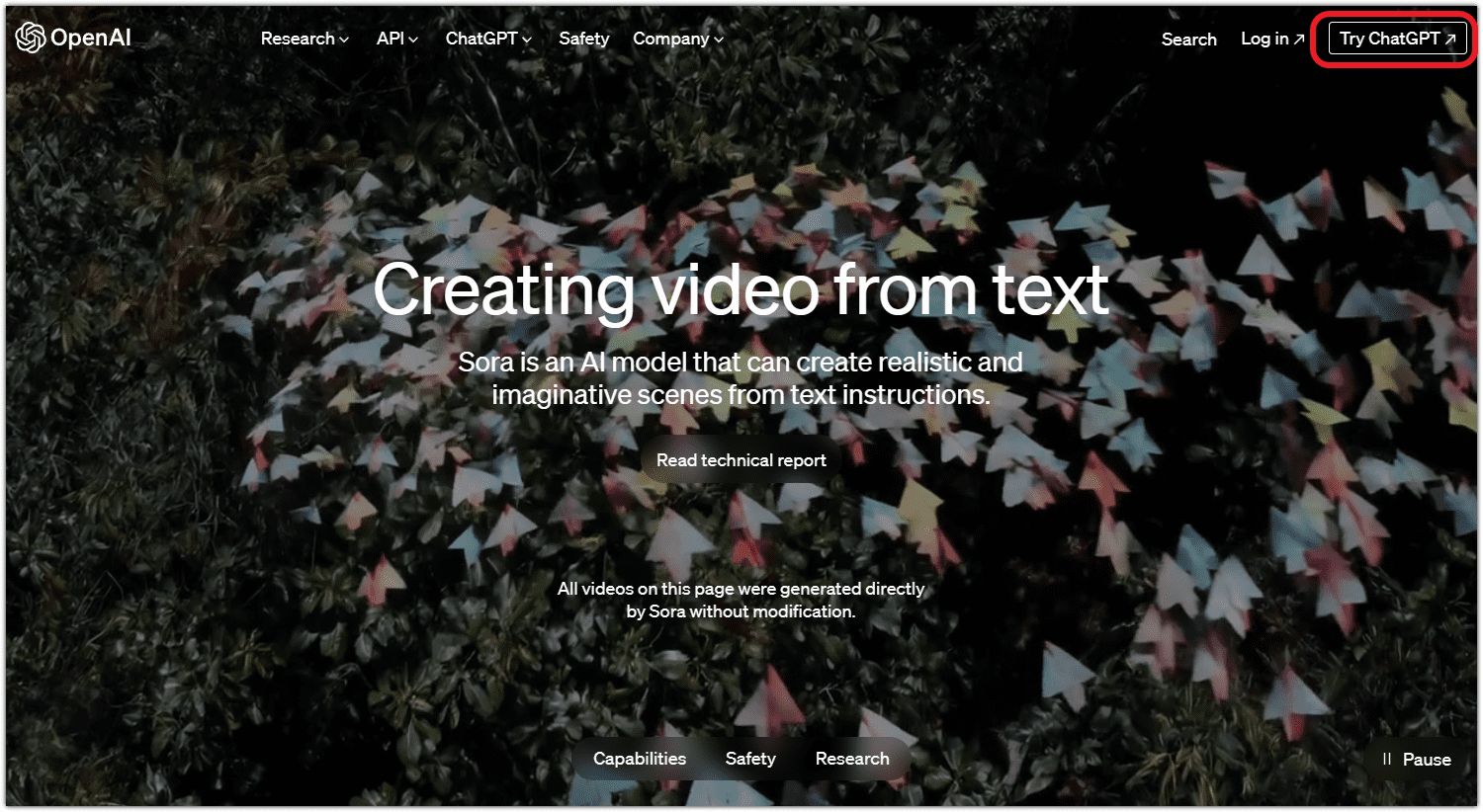 소라 ai 홈페이지 첫 화면 입니다. 아직은 일반인들에게 공개되지 않아서 시도해볼만한 뭔가는 없습니다. 화면의 아래로 내리면 openAI사에서 소라 ai를 어떻게 구동하는지 예시를 보여줍니다.