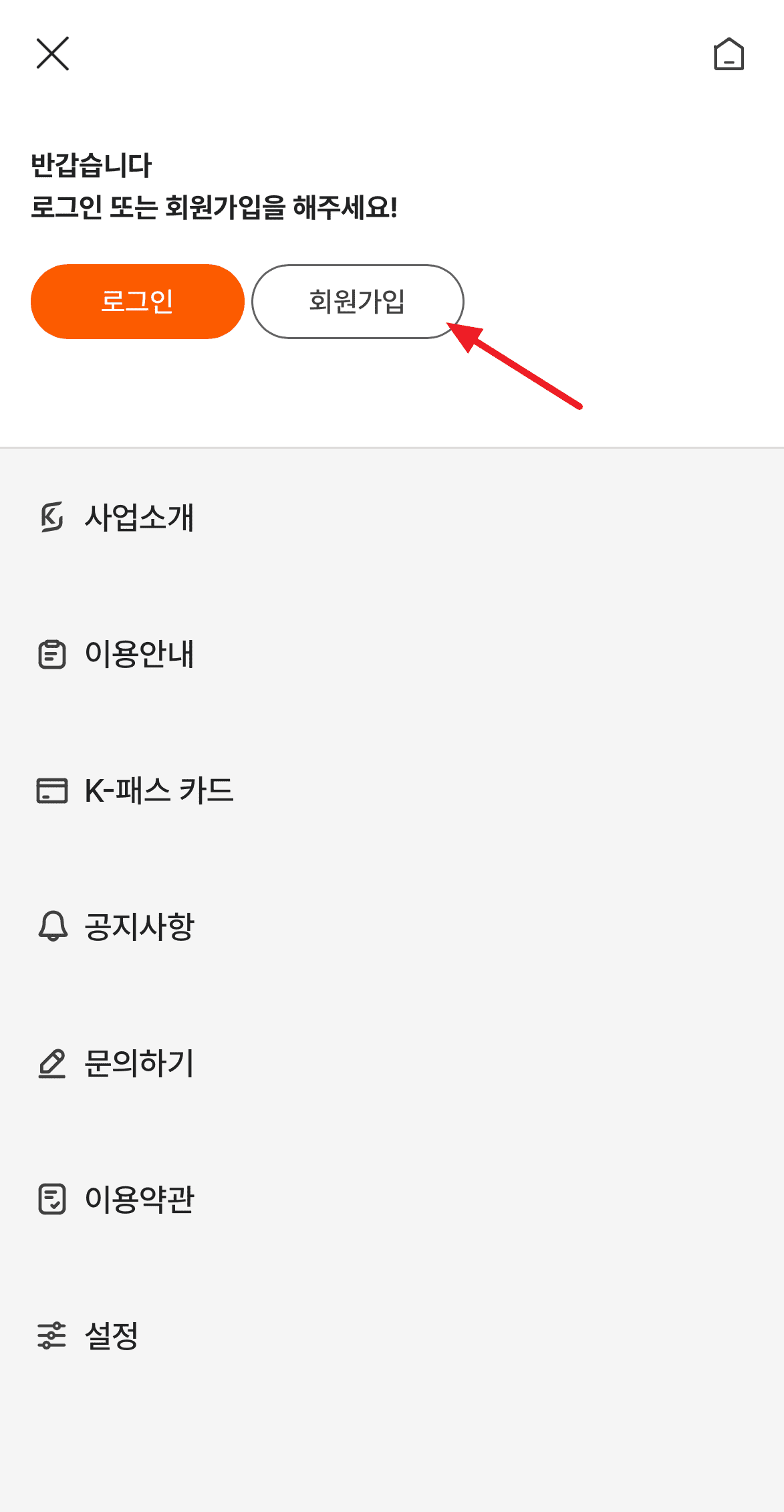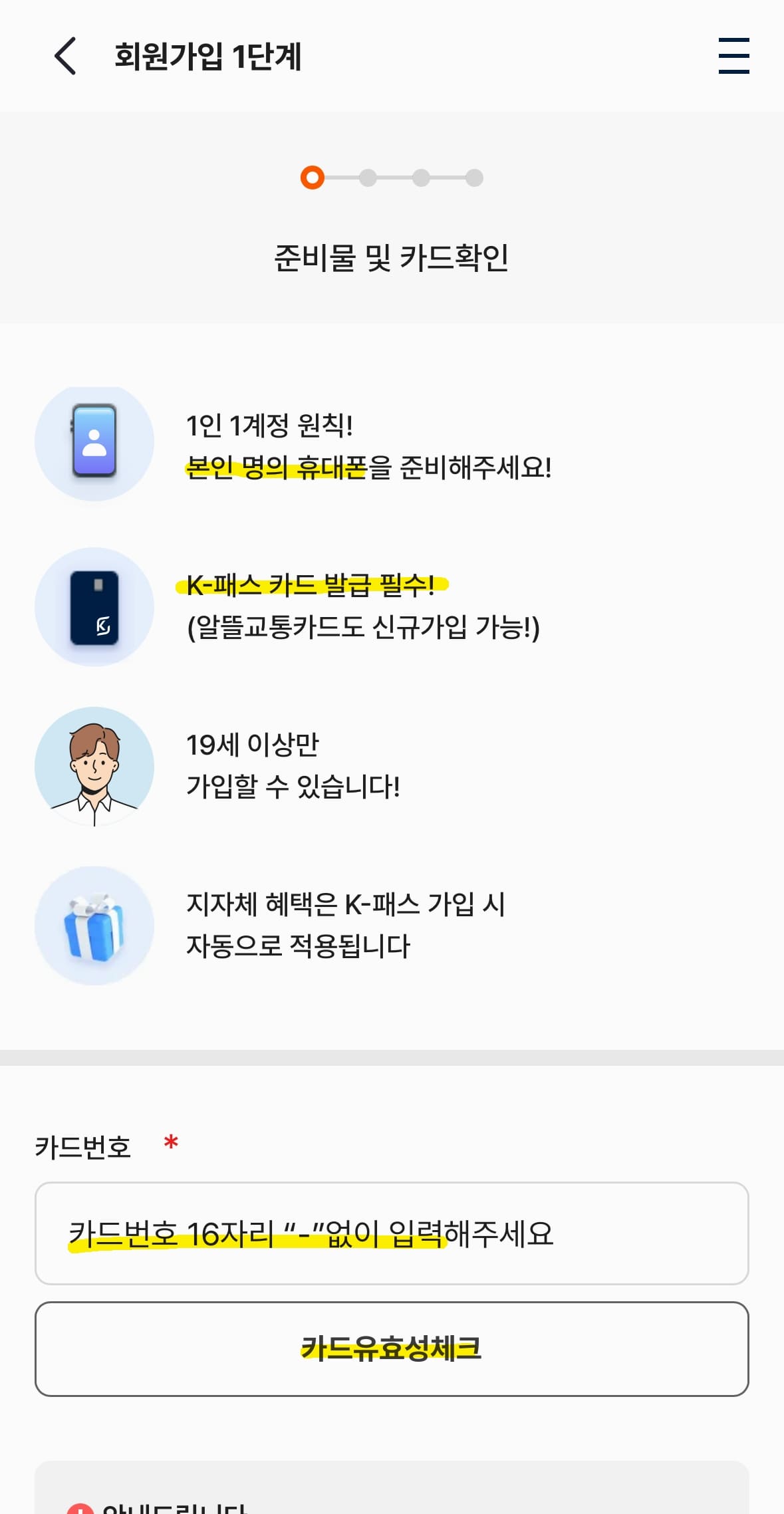 K패스 회원가입 하려면 본인 명의의 스마트폰, K-패스 카드 발급 후 카드번호를 입력해야 됩니다.