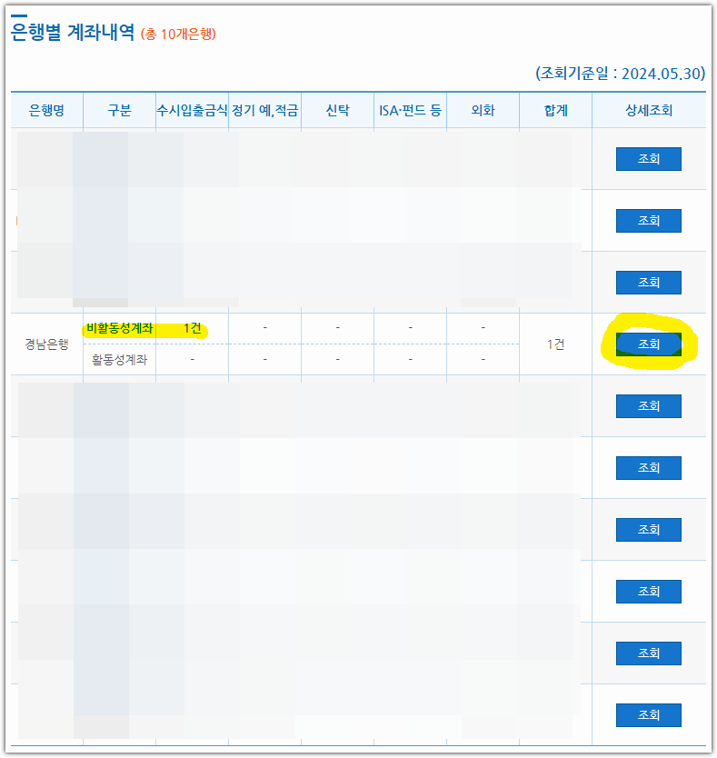 '비활동성 계좌'는 해지 / 잔고이전 신청이 가능 합니다. [ 조회 ] 버튼을 누릅니다.