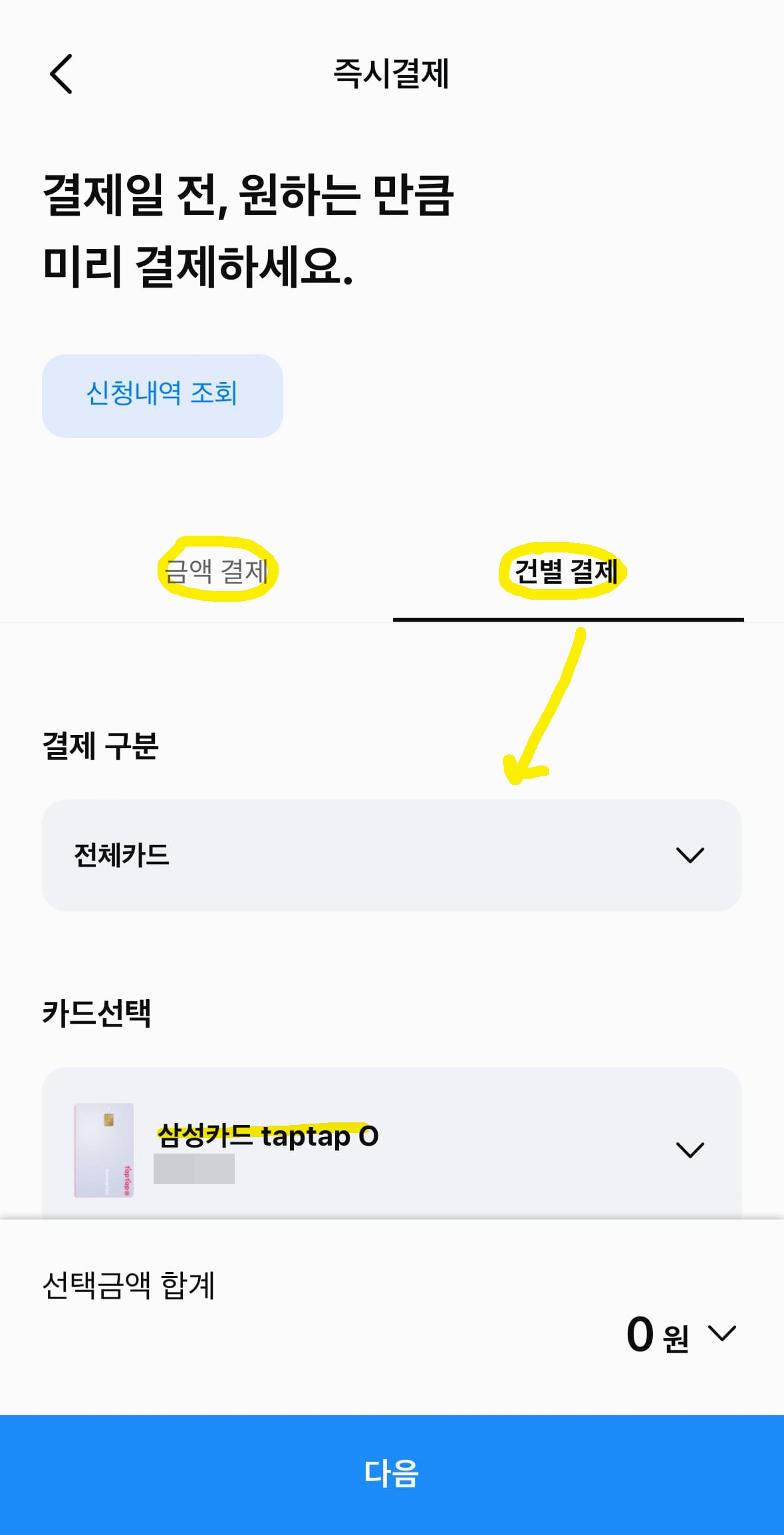 삼성카드 즉시결제는 금액결제 또는 건별결제가 가능한데요. 금액결제는 원하는 금액만큼 선결제 할 수 있고 건별 결제는 결제 건별로 선택해서 결제 할 수 있습니다. 이 글에서는 '건별 결제' 방법에 대해 보여드리겠습니다.
