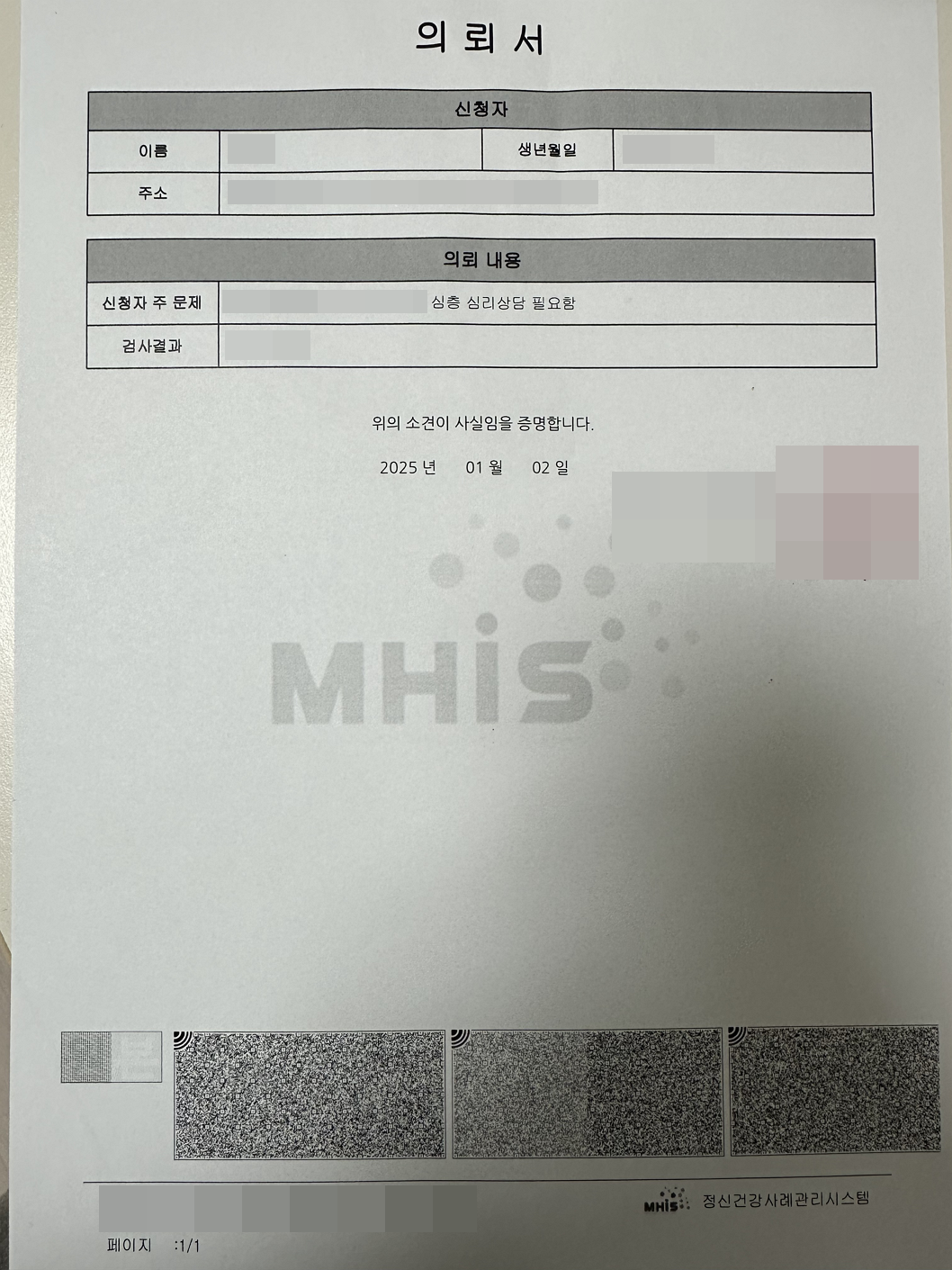 저는 기존에 심리상담이나 정신과 이력이 없어서 제가 거주하는 시에 있는 '정신건강복지센터'에 방문해서 '전국민 마음투자 지원사업' 의뢰서를 요청 했습니다.