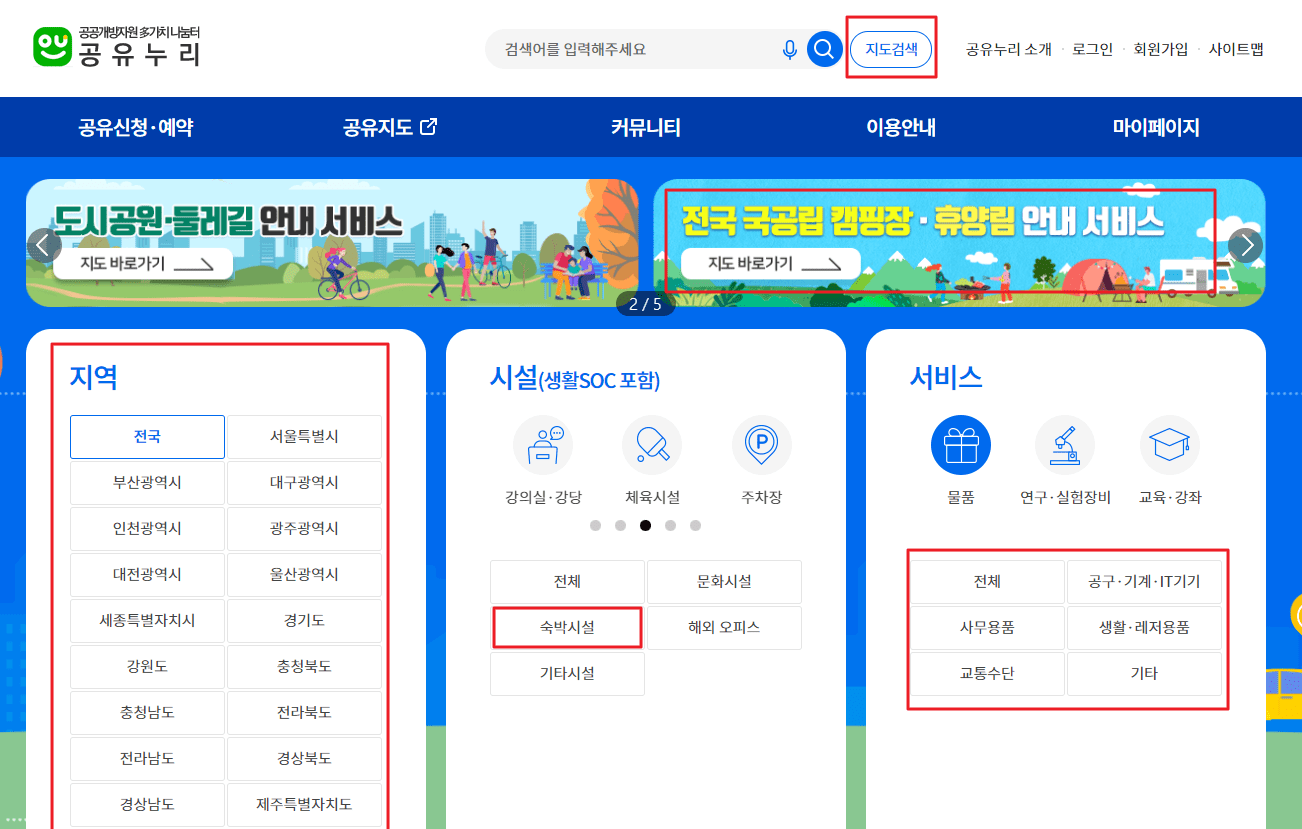 공유누리는 숙박시설 뿐만 아니라 국민에게 제공하는 시설 및 물품 등 공공개방지원들을 온라인에서 쉽게 검색하고 예약할 수 있도록 만든 대국민 공공개방자원 공유서비스 포털 입니다. 위와 같이 숙박시설 외에도 사무용품, 공구, 기계, 생활 레저용품, 문화시설 등 다양한 국공립에서 제공하는 공공개방자원 서비스를 확인하실 수 있습니다. 지역별로도 확인 가능하며, 지도 검색으로도 조회 가능 합니다.