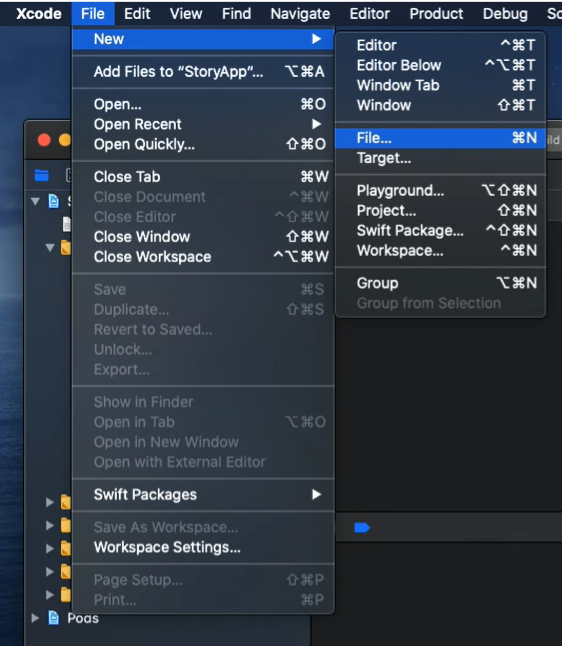 커서를 포로젝트 Root에 두고 Xcode ToolBar에서 File > New > File 로 새로운 파일을 생성한다.
