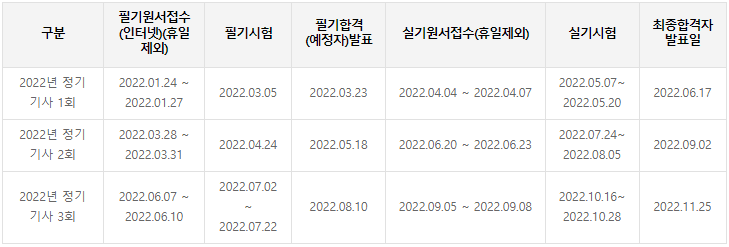 2022년 정보처리기사 시험일정은 정기 기사 1회 - 3회까지 있습니다.