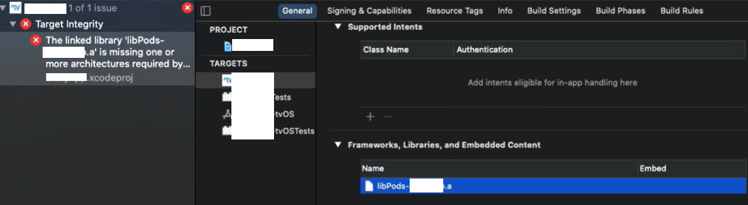 'The linked library 'libpods-...a' is missing one or more architectures required by..'