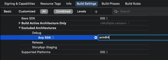 Build Settings > Excluded Architectures > Any SDK > arm 64 추가해 줘야함