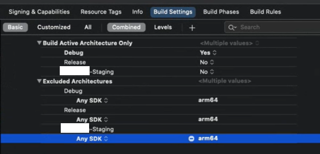 Excluded Architectures Staing으로 build하는데 Debug에만 'arm64'가 설정되어 있었다.